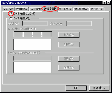 | 4. | [DNS設定]タブをクリックし、[DNSを使わない]を選択して[OK]をクリックする |