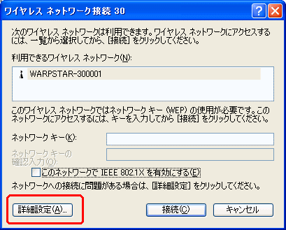 下画面で、直接「ネットワークキー」を入力することでも接続可能ですが、設定内容をご確認いただくため[詳細設定]ボタンから以下の手順で設定を行ってください。 |