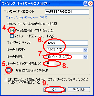 [OK]をクリックします。「ワイヤレスネットワークへの接続」画面に戻りますので、残りの設定を行ってください。