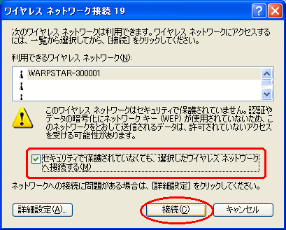 「セキュリティで保護されていなくても、選択したワイヤレスネットワークへ接続する」をチェックし、続いて[接続]をクリックします。 |