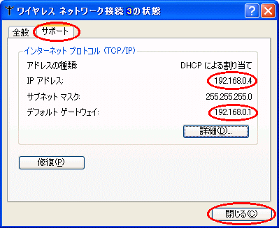 「サポート」タブをクリックし、IPアドレスとデフォルトゲートウェイが正しく「192.168.0.xxx」になっていることを確認したら、「閉じる」をクリックします。 |
