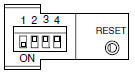 細い棒状のもの(つまようじなど電気を通さない材質のもの)でディップスイッチを「ON」側に倒してください。 |