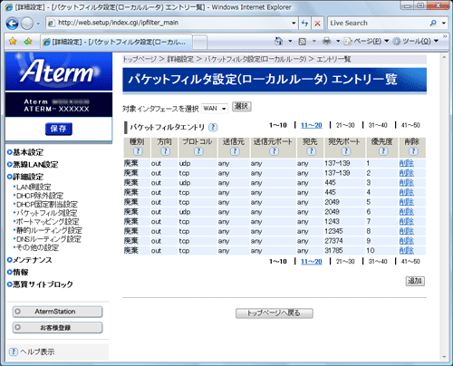 「パケットフィルタ設定 エントリ」のエントリ一覧に表示されているエントリの中から、削除したいエントリの行末の[削除]をクリックすることで削除できます。 |