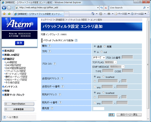 | ※画面の[追加]をクリックすると[パケットフィルタ設定 エントリ追加]画面に進みます。 |