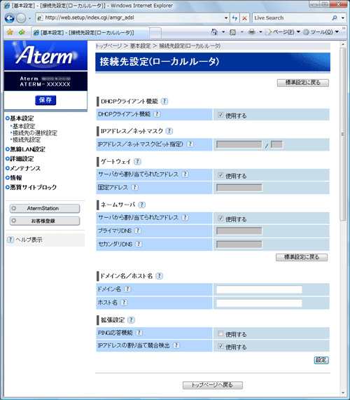 - 動作モードを切り替えた場合(PPPoEルータモード←→ローカルルータモード)[ネームサーバ]の設定値は、初期値に戻ります。動作モードを切り替えた後は設定値の見直しをして、再度設定してください。