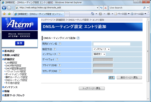 ※画面の[追加]をクリックすると[DNSルーティング設定 エントリ追加]画面に進みます。