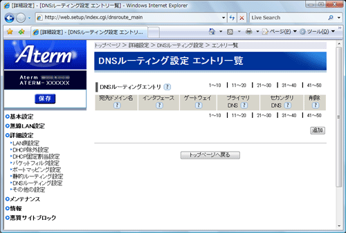 本商品では[DNSルーティングエントリ]のパターンを最大50個設定できます。