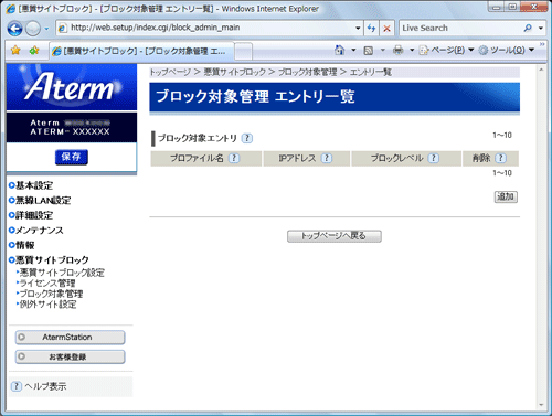 本商品では、[ブロック対象エントリ]の管理数を最大10個まで設定できます。