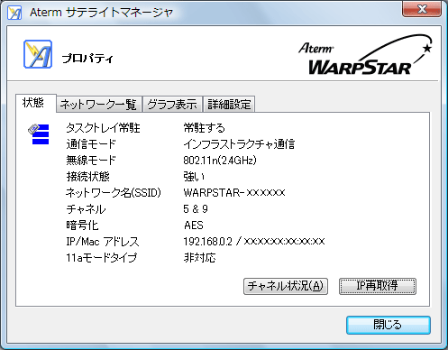 現在使用中のサテライトのIPアドレスとMACアドレスが表示されます。 |