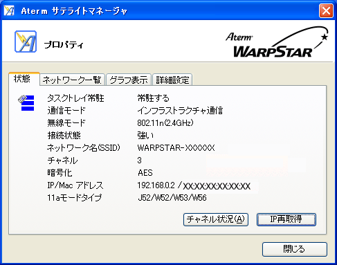 現在使用中のサテライトのIPアドレスとMACアドレスが表示されます。 |