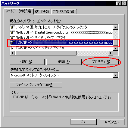 | 1. | [スタート]-[設定]-を開き、リストの中の[TCP/IP->(WL54SEが使用しているネットワークボード名)]を選択し、[プロパティ]をクリックする |
