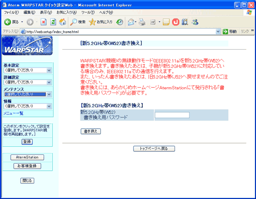 新5.2GHz帯(W52)書き換え用パスワードを入力します。