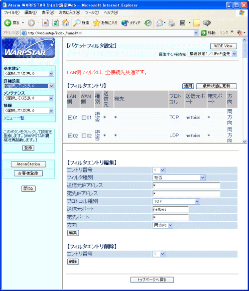 また、工場出荷時にエントリ14〜18番が適用されていますが、これらはNetBIOS等によるWAN側への意図しない情報漏洩を防止するためのものです。