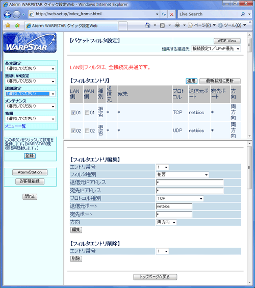 また、工場出荷時にエントリ14〜18番が適用されていますが、これらはNetBIOS等によるWAN側への意図しない情報漏洩を防止するためのものです。