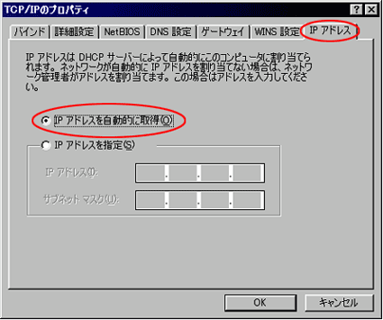 | 2. | [IPアドレス]タブをクリックし、[IPアドレスを自動的に取得]を選択する |