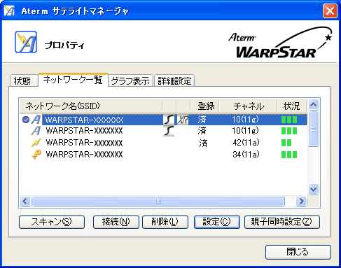 - もしネットワーク名(SSID)に何も表示されない場合、無線LANアクセスポイント(親機)の電源を切り、再度投入し、[サテライトマネージャ]-[ネットワーク一覧]-[スキャン]をクリックしてください。