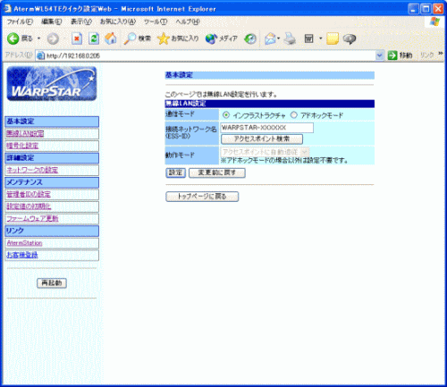 802.11aのネットワーク名初期値は、「WARPSTAR-XXXXXX-A」でXXXXXXおよび暗号化キーは802.11g+bと同じです。 |