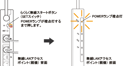 もう一度、らくらくスタートボタン(SETスイッチ)を長押し、POWERランプが橙点灯状態になったら離す。 |