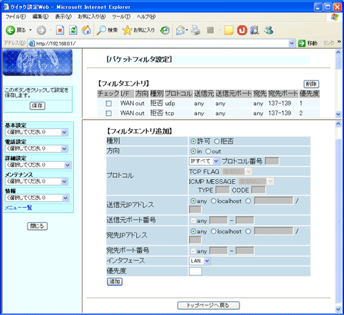 フィルタリング対象とするIPプロトコル種別を設定してください。