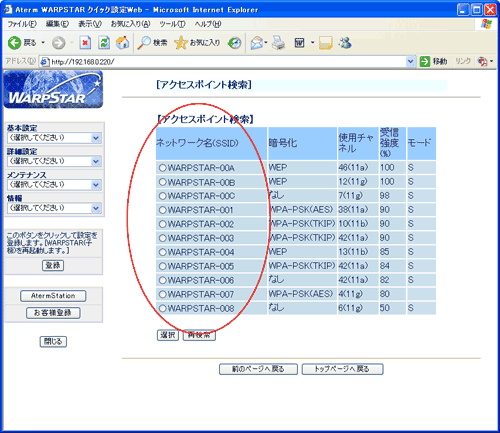 [アクセスポイント検索]画面で接続するネットワーク名(SSID)をクリックする |