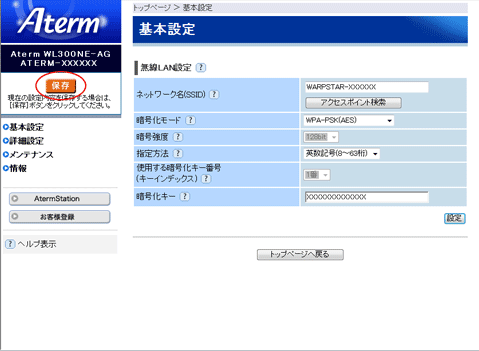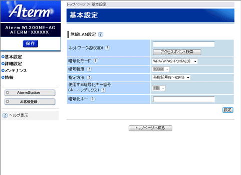 無線LANアクセスポイント(親機)の暗号化設定に合わせて暗号化の設定を行う |