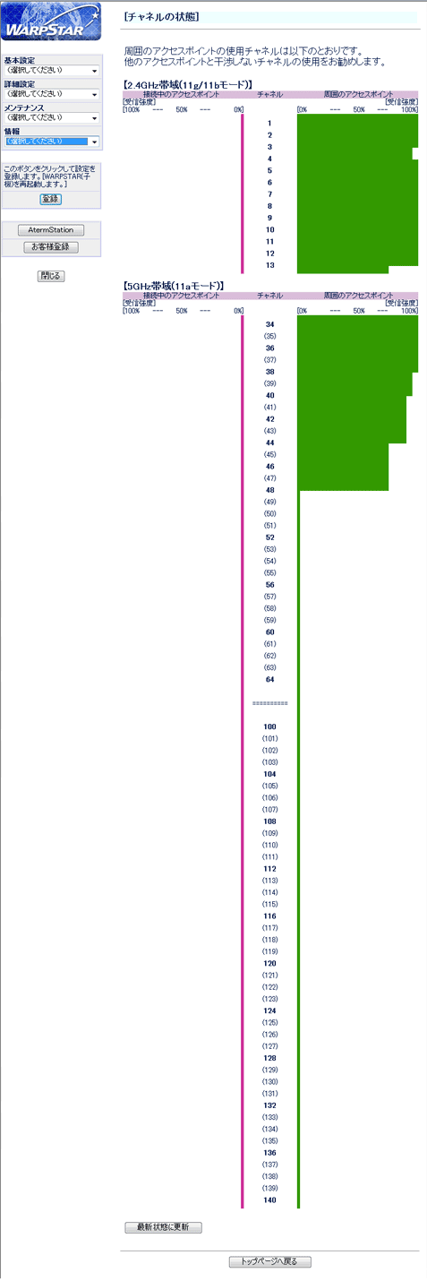 | 周囲の無線LANアクセスポイント(親機)のチャネルの状態を表示します。 |