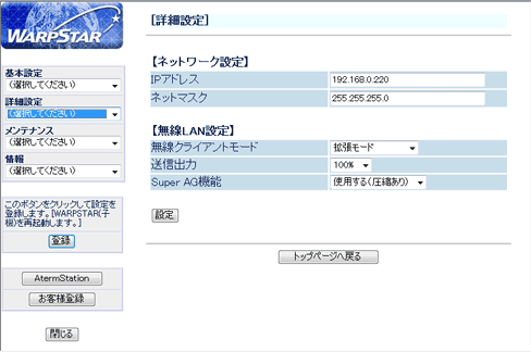 WL54SE2での設定を変更する場合に以下の「クイック設定Web」を使用します。