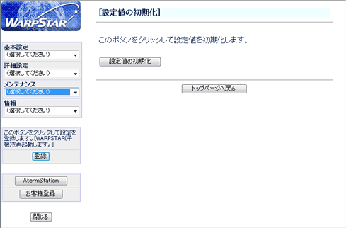 「設定値の初期化」をクリックするとWL54SE2の設定が初期値に戻ります。 |