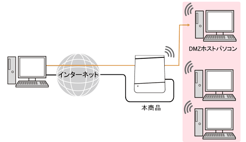DMZホスト機能とは、外部(インターネット)からアクセス可能となるホストを設定することです。 本商品では、DNSサーバ、メールサーバ、Webサーバなどの各種サーバを外部に公開する場合や、ネットワークゲームなど多数のTCP/UDPポートを使用するアプリケーションを使用する場合に、DMZホストを設定することで利用可能となることがあります。