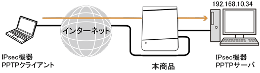仮想プライベートネットワーク(VPN : Virtual Private Network)機能とは、ネットワーク上にVPNを構築することによって、リモート側にある機器とプライベート側にある機器との間で、セキュリティで保護されたデータ通信を可能とするものです。 本商品は、IPsec(IP Security)またはPPTP(Point to Point Tunneling Protocol)によるVPN通信に対して、パススルー機能を搭載することにより、これらのVPN通信を通過させることができます。