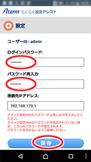 ※ 本アプリで設定したログインパスワードとクイック設定Webの管理者パスワードは共通です。すでに、クイック設定Webで設定済みの場合は 設定されているパスワードを入力してください。
