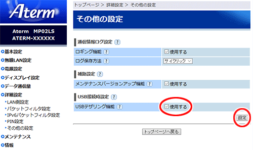 クイック設定Webの「詳細設定」-「その他の設定」でUSBテザリング機能の「使用する」にチェックされているか確認してください。チェックが外れている場合はチェックし、[設定]を押してください。