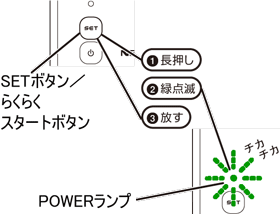 POWERランプが通常点灯したらすぐにSETボタンを長押しし(約6秒)、緑点滅になったら放す