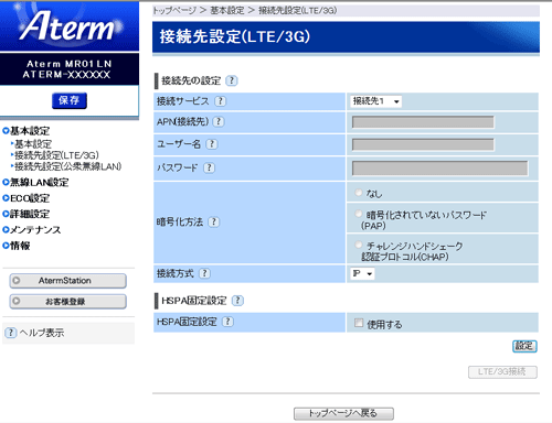 利用する接続サービスを指定します。通信事業者の指定にしたがってください。