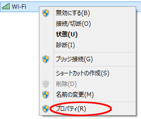 本商品が接続されているネットワークアダプタ名(下記を参照)を 右クリックし、[プロパティ]を選択する |