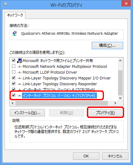 リストの[インターネットプロトコル バージョン4(TCP/IPv4)]を選択し、[プロパティ]をクリックする |