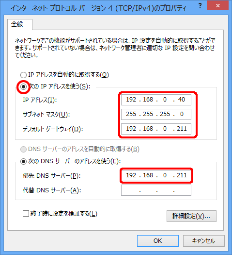 [次のDNSサーバーのアドレスを使う]を選択し、[優先DNSサーバー]に本商品のIPアドレス(192.168.0.211)を入力する |