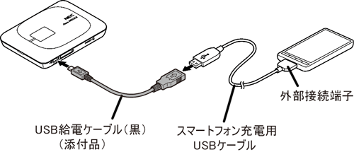 本商品のUSBポートに、USB給電ケーブル(黒)でスマートフォンなどの携帯端末を接続したときに、本商品からスマートフォン側に電源供給することができます。