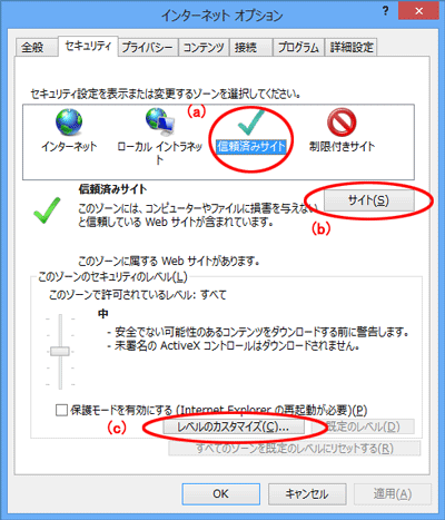[信頼済みサイト](<図1>の(a))を選択して、[サイト](<図1>の(b))をクリックする |