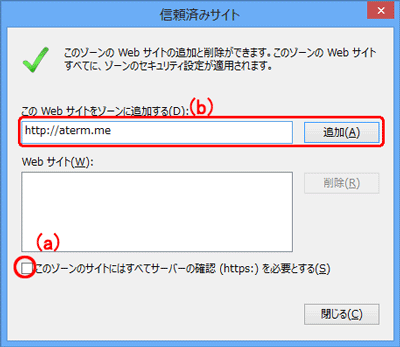[このWebサイトをゾーンに追加する]に「 http://aterm.me/ 」と入力し、[追加]をクリックする