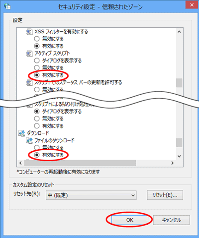 画面をスクロールし、[アクティブスクリプト]と[ファイルのダウンロード]を[有効にする]に変更し、[OK]をクリックする |