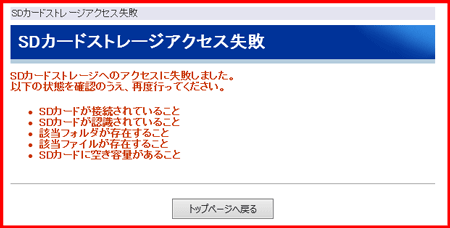 - SDカードデバイスにアクセス開始時、または操作中に下記の画面が表示された場合、SDカードデバイスへのアクセスに失敗しています。
