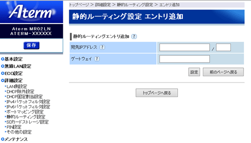 | 詳細設定−静的ルーティング設定 |