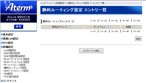 | ※画面の[追加]をクリックすると[静的ルーティング設定 エントリ追加]画面に進みます。 | ||||||||||||||||||||||||||||||||||||||||||