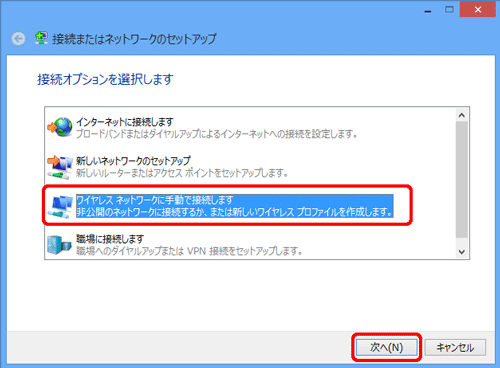 「ワイヤレスネットワークに手動で接続します」を選択し、[次へ]をクリックする |
