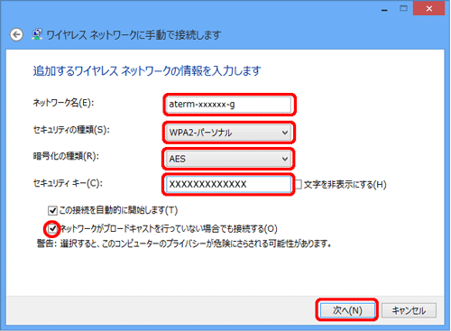 無線LAN親機が「ESS-IDステルス機能(SSIDの隠蔽)」を使用している場合は、「ネットワークがブロードキャストを行っていない場合でも接続する」にチェックを入れる |