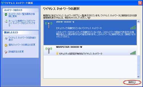 接続する無線LAN親機のネットワーク名(SSID)を選択し、[接続]をクリックし