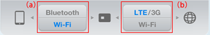 本商品とスマートフォンなどをBluetoothテザリングで接続するときは中央の本商品イラストの左側ボタン(a)をタップし、Wi-FiからBluetoothに切り替えます。LTE/3Gと公衆無線LANを切り替えるときは右側のボタン(b)をタップしてください。