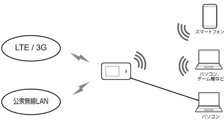 LTE/3G回線や公衆無線LANサービス網を利用して、インターネットに接続するモードです。USBケーブルやクレードルを使用してLANケーブルなどの有線接続でも通信できます。