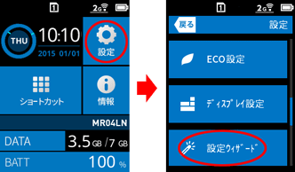 本商品では、Wi-Fi接続やAPNの設定などインターネットに接続するまでの作業を、設定ウィザードを使って設定することができます。ディスプレイに表示される手順にしたがってタッチパネルを操作します。